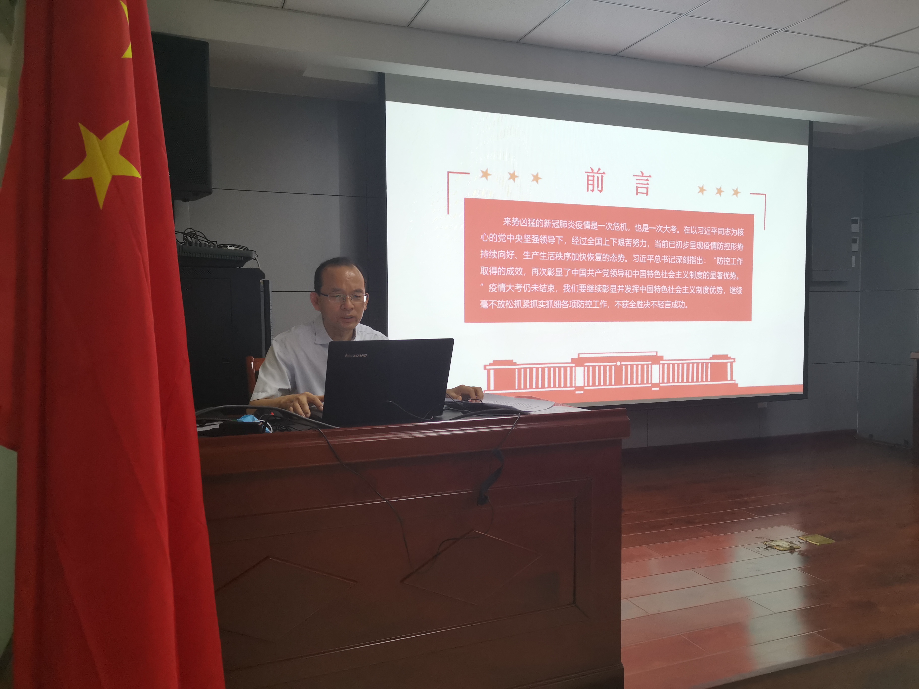 2020年7月2日上午,中共华体会手机网页版-华体会(中国) 第二支部委员会支部书记焦俊良同志以“在大考中彰显中国特色社会主义制度优势”为题,为全体支部党员和入党积极分子上了一堂别开生面的党课。