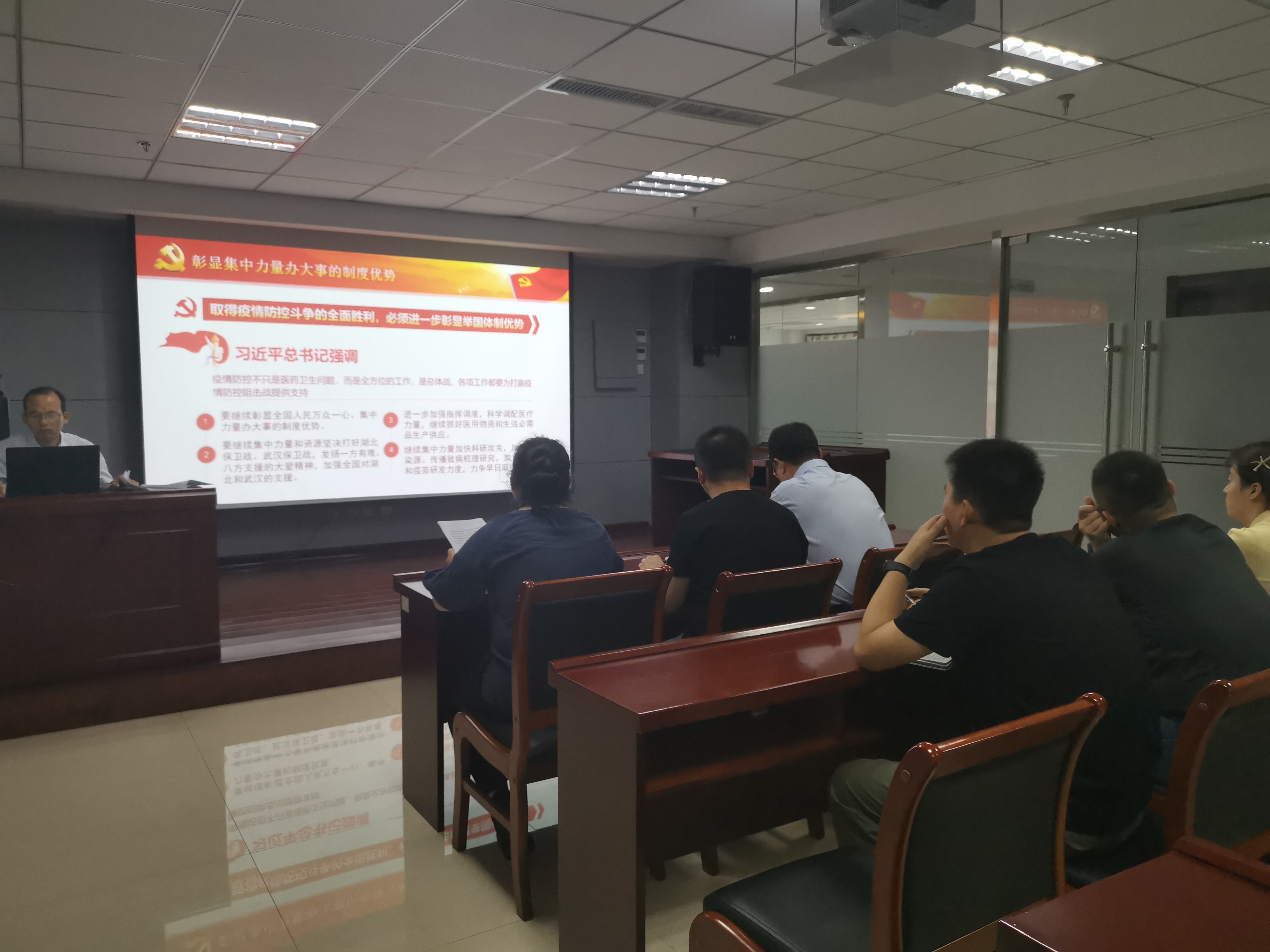2020年7月2日上午,中共华体会手机网页版-华体会(中国) 第二支部委员会支部书记焦俊良同志以“在大考中彰显中国特色社会主义制度优势”为题,为全体支部党员和入党积极分子上了一堂别开生面的党课。