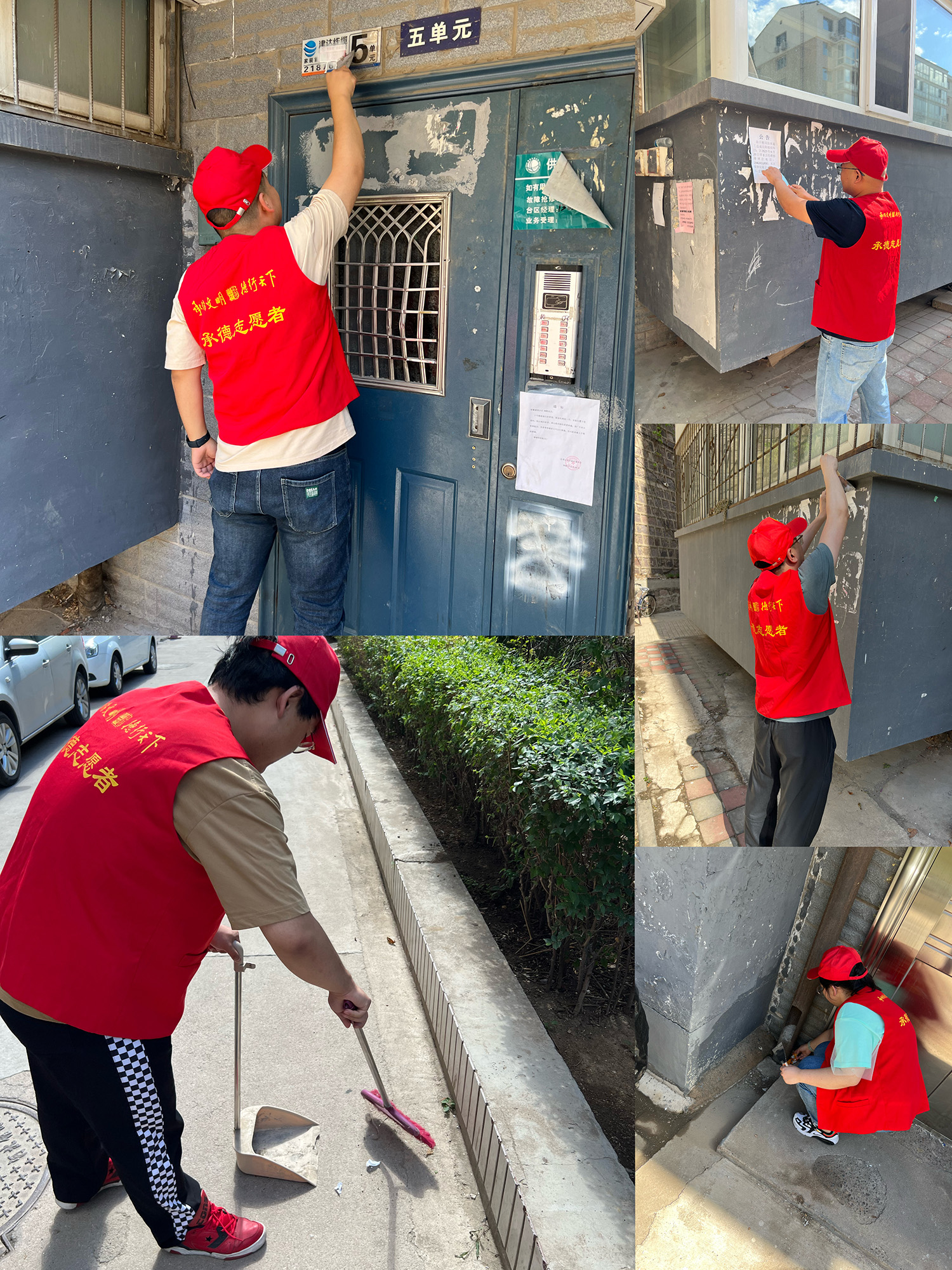 在活动现场,大家身穿红色志愿者马甲,手持铲子、扫帚、簸箕等工具,在炎炎夏日中为小区居民打扫小区卫生,着重清除非法小广告以及卫生死角、乱点。
